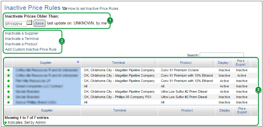 Inactive Price Rules lets you inactivate any combination of supplier, terminal, and product that you don’t use without permanently removing them from your account. Price displays and reports (including Market Analysis, Price Analysis, and Best Rack) will not include the associated prices as long as they remain inactivated. But any time you want to see them back in the mix, you simply reactivate.